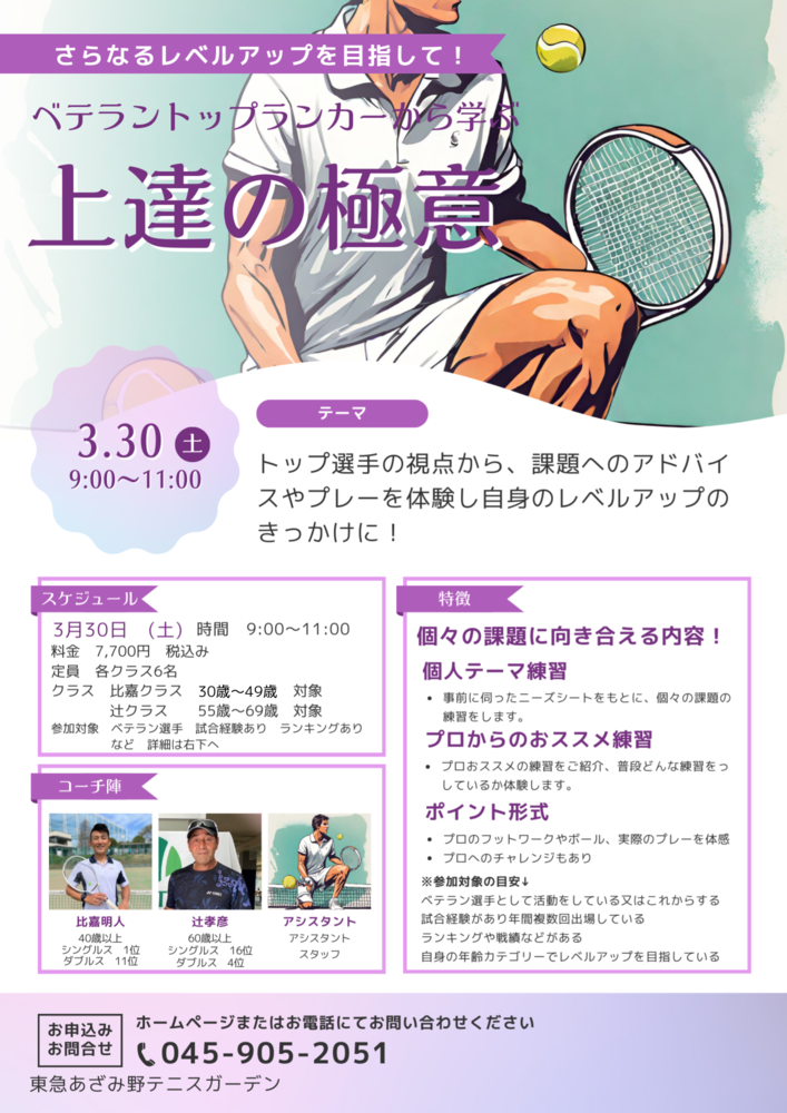 3月30日(土)ベテランの試合にチャレンジしている方向けに、ベテランのトッププレーヤーの比嘉コーチと 辻コーチのレッスンを行います。