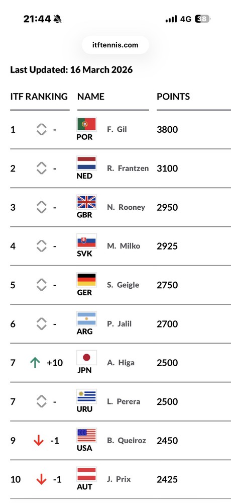 さらに今回の結果で、40歳以上シングルスの世界ランキングが7位 になりました!