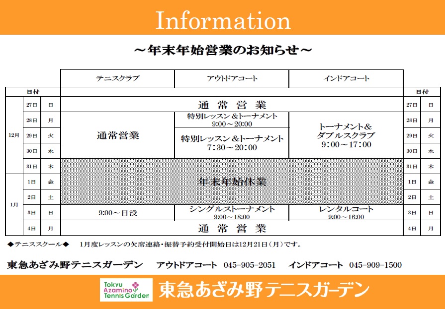 年末年始営業のお知らせ