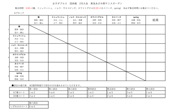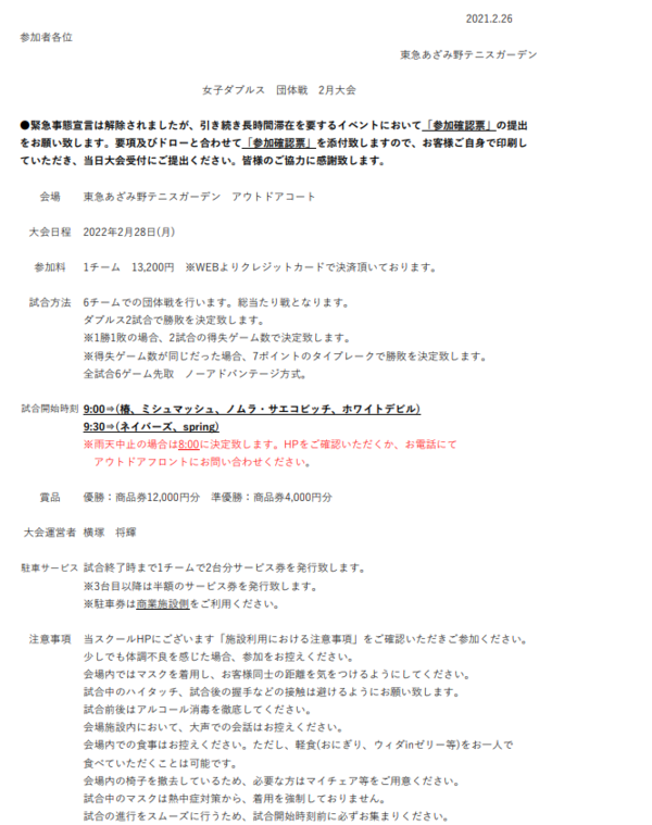 2/28 女子D団体戦 要項及びドロー 参加確認票 感染対策のお願い