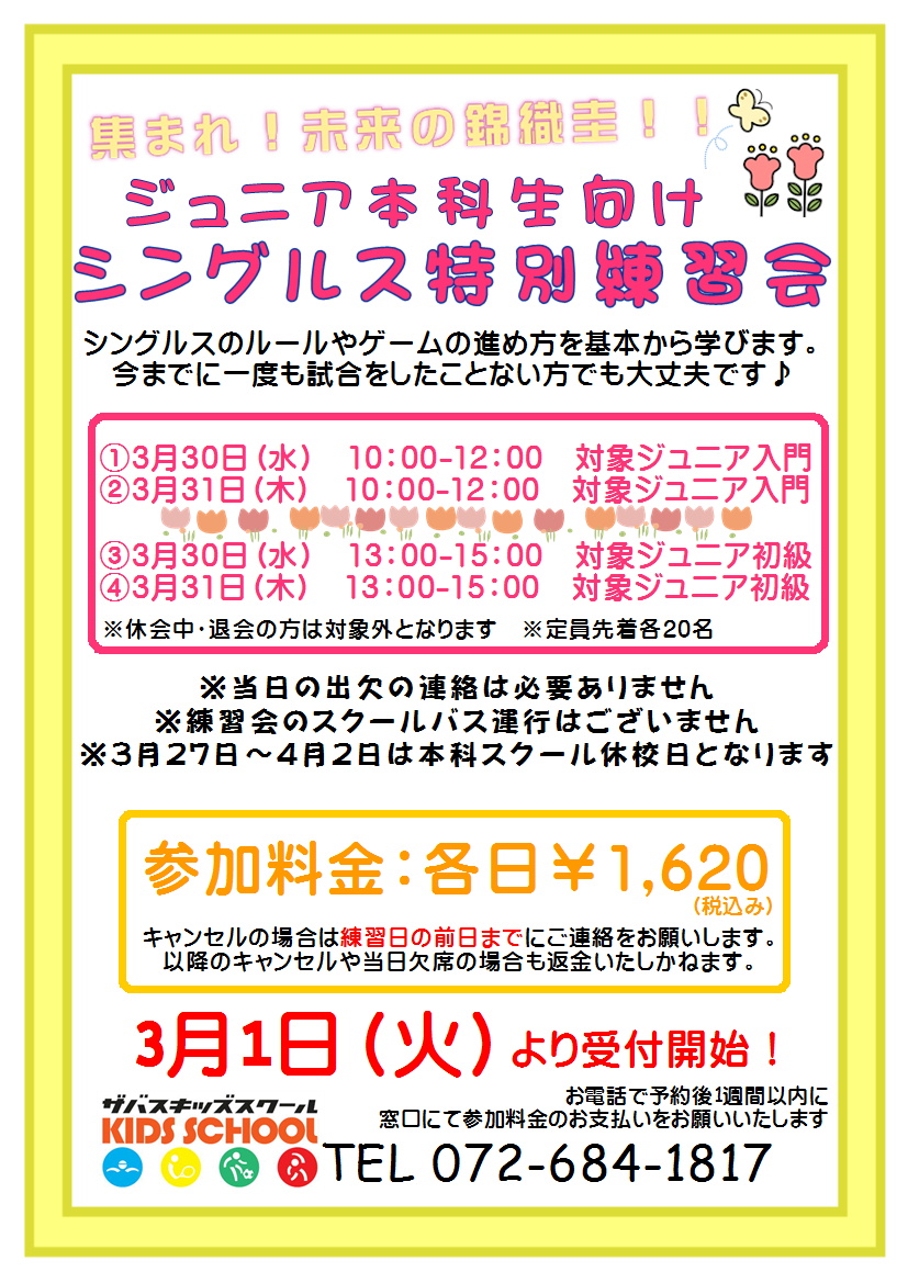 ザバス休館日の3月30(水)・31日(木)に『ジュニアシングルス特別練習会』を開催します。
