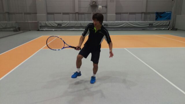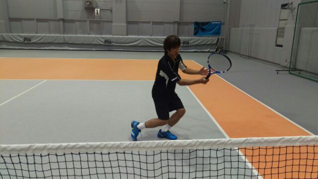 『後ろの膝を寄せるようボレーをしてみて下さい。』