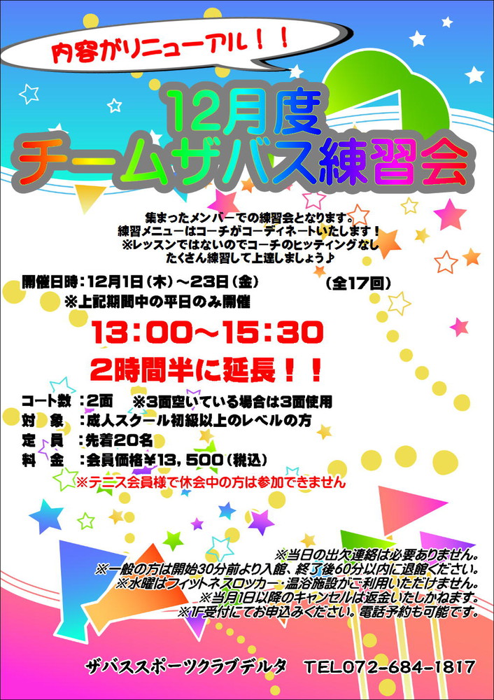 ザバスの??がリニューアルの??は『チームザバス練習会』と『チームザバスライト』が12月から一部変更になります。