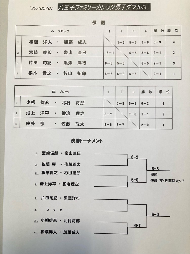 GWに行われたハチファミ男子ダブルスの結果です。