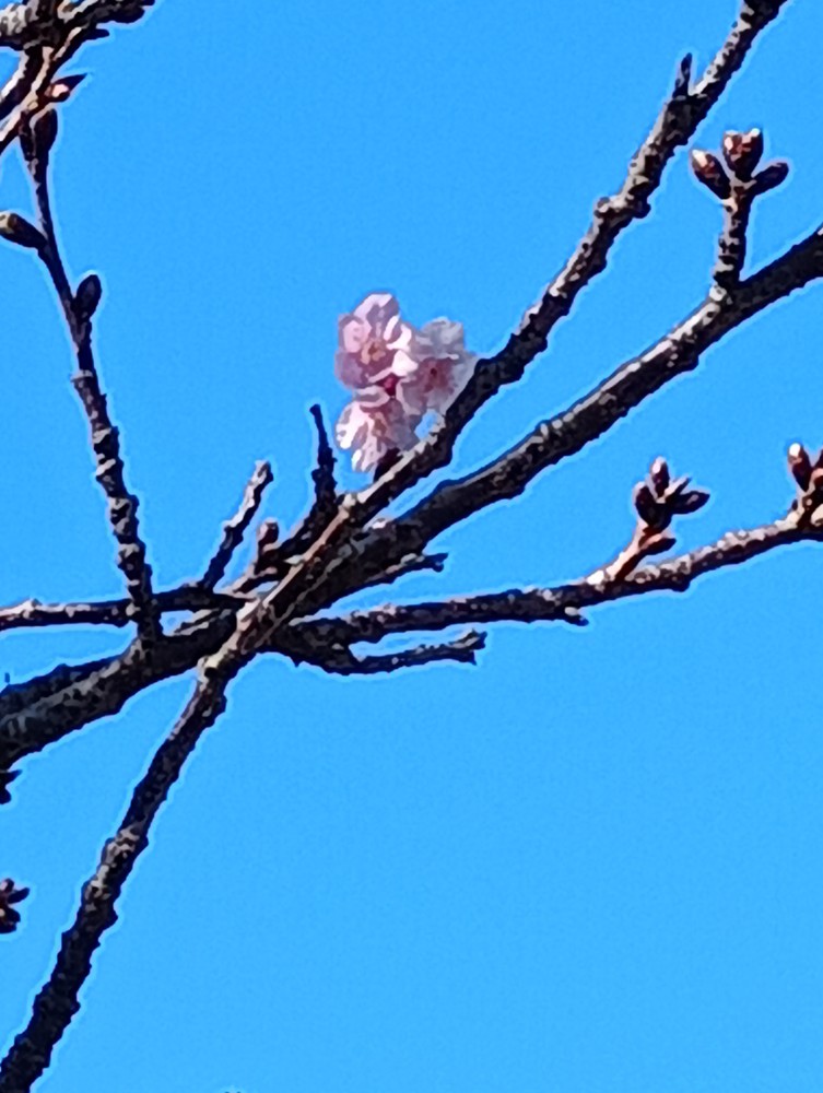 食後に、下田方面で河津桜が咲く『みなみの桜』付近の川沿いに散歩しに行きました。例年早くても2月に入ってから咲き始める河津桜ですが、ところどころ一輪咲いていました。……開花!?