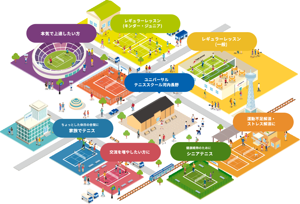 初めてラケットを握る方や、レッスンを受けたことのない方から、高度なテクニックなど、勝てるプレーの習得を目指す上級者クラスまで全てのレベルにご対応できるクラスが揃っています。