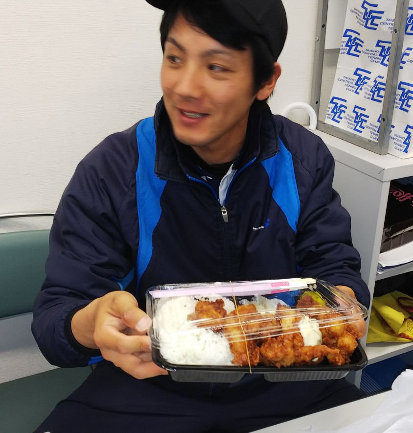 写真はうっかり近所のお弁当屋さんで買ったお弁当があまりにも大盛りすぎてびっくりして挙動不審になってしまった西入コーチです。笑