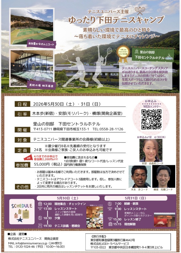 今回は、いつものマイブーム的なものではなく、5月30日(土)、31日(日)に行われるテニスユニバース主催のテニスキャンプの告知をしたいと思います。
